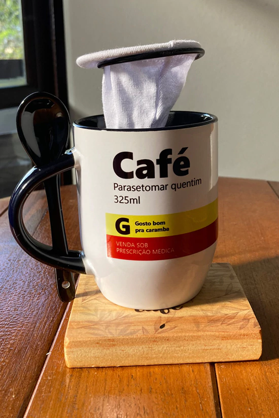 Coador de pano com base de madeira estampada com a frase " O dia só começa depois do café"