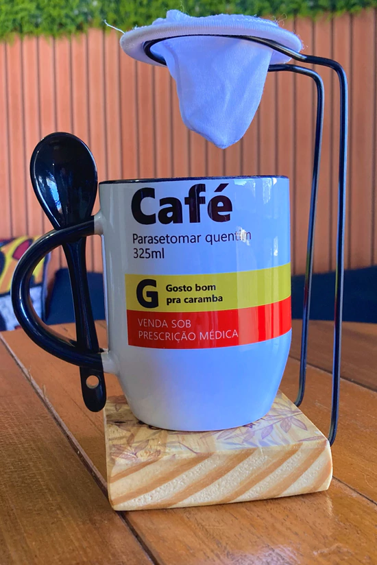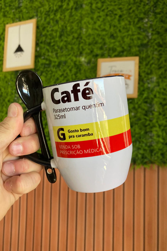 Esta caneca com estampa que lembra um remédio é perfeita para os amantes de café que apreciam cada gole quentinho.