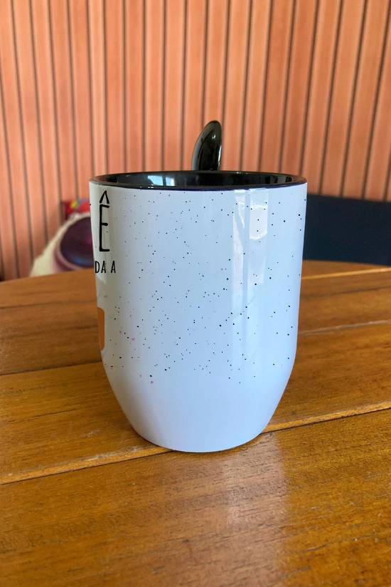 • Cor: Caneca de cerâmica branca com interior e alça preto e colher