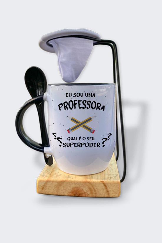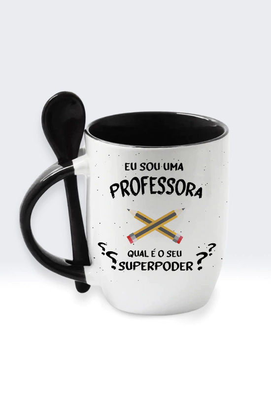 Caneca Eu sou professor(a) qual o seu superpoder Surpreenda aquele educador especial com um presente que demonstra todo seu carinho e admiração! Esta caneca de cerâmica, com interior preto e colher, é perfeita para saborear um café quentinho durante as aulas.