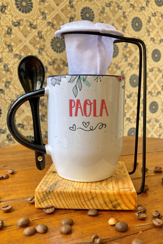 A caneca personalizada vem com o nome da sua mãe na frente e, no verso, uma mensagem especial com o significado de ser mãe — tudo isso acompanhado de um charmoso coador de café artesanal com base em madeira.