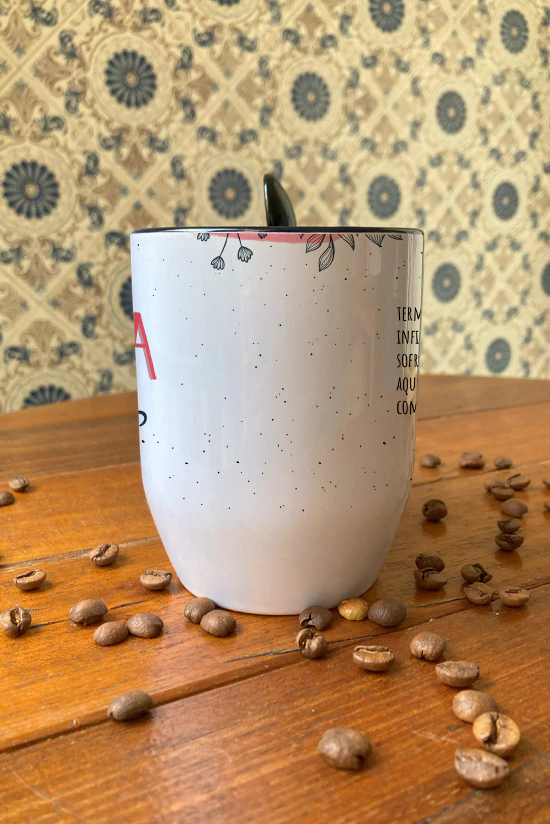 • 01 Caneca de cerâmica de 325ml com interior preto + colher, personalizada com o nome da sua mãe
