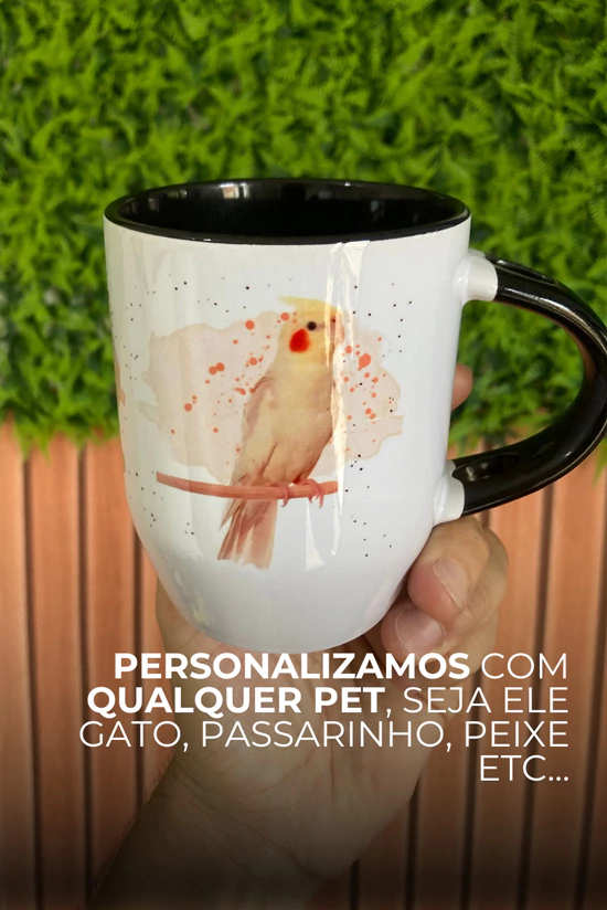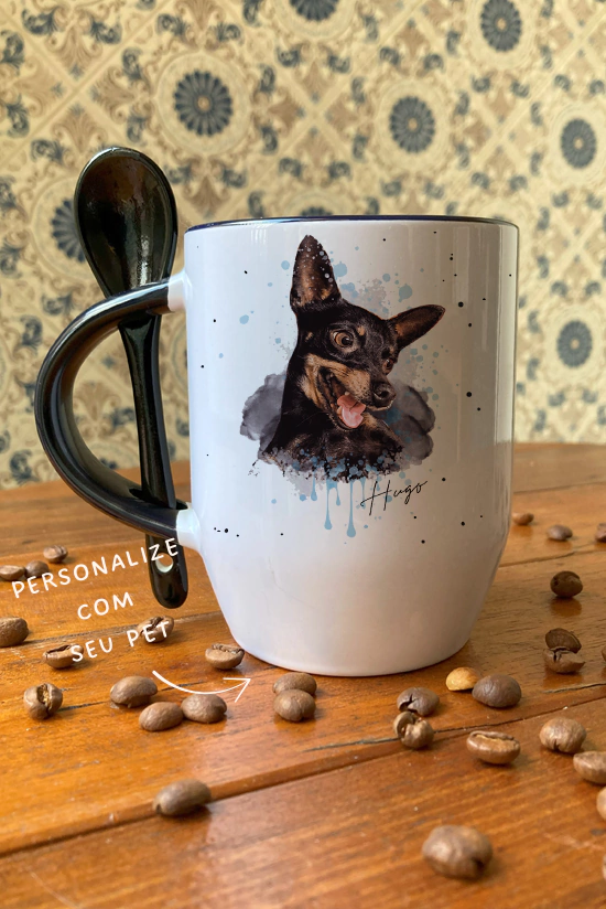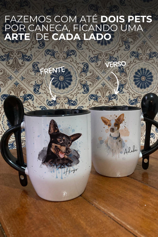 • Arte personalizada do seu pet, aplicada na caneca e no coador