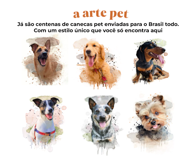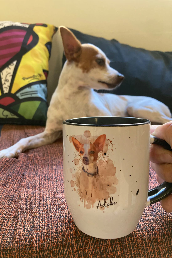 Com o Caneca Pet Aquarela, você envia a foto do seu bichinho e nós transformamos em uma arte exclusiva no estilo aquarela.
