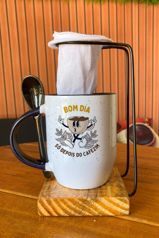 Coador de pano com base de madeira estampada com a frase "O dia só começa depois do café".