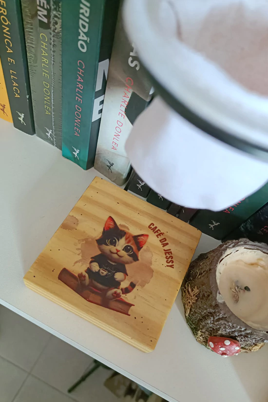 • Coador: Coador de café individual com base de madeira estampada no tema