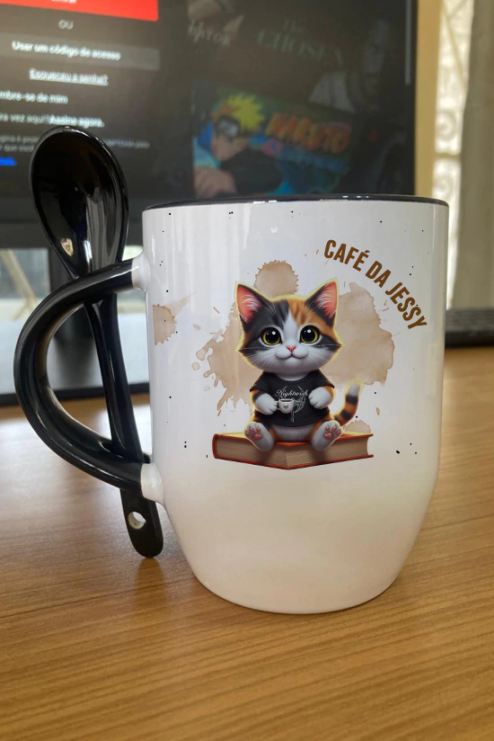 • Cor: Caneca de cerâmica branca com alça, interior preto e colher