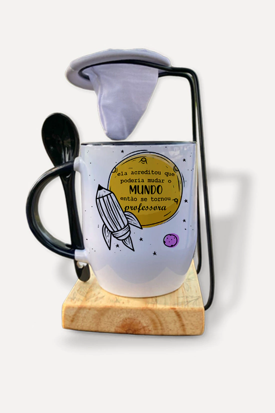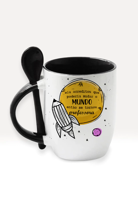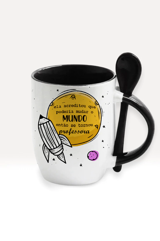 Caneca Ela acreditou que poderia mudar o mundo por isso se tornou professora: Surpreenda aquele educador especial com um presente que demonstra todo seu carinho e admiração! Esta caneca de cerâmica, com interior preto e colher, é perfeita para saborear um café quentinho durante as aulas.