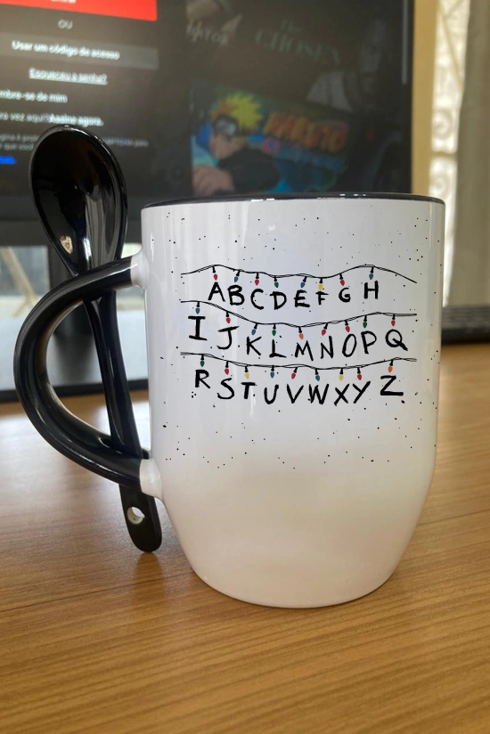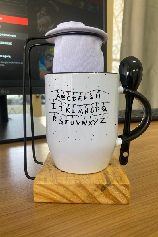 Prepare seu café como se estivesse na cafeteria do Hawkins Mall ou na sala da Joyce Byers! A estampa exclusiva traz referências icônicas da série, perfeita para fãs que querem sentir um pouco da nostalgia dos anos 80 enquanto saboreiam seu café favorito. Escolha entre levar só a caneca ou montar o Kit completo com coador para deixar seu momento ainda mais especial.