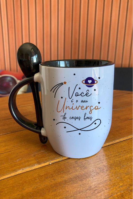 - 01 caneca personalizada com estampa do universo, capacidade de 325ml, com colher de interior e alça preta.