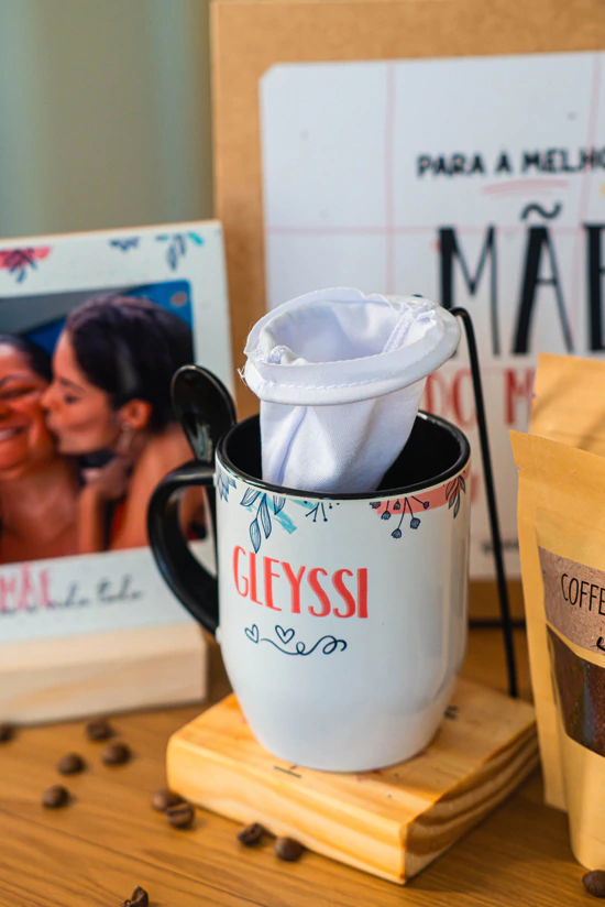 Este kit de presente personalizado é perfeito para você surpreender sua mãe. Ele inclui uma caneca de cerâmica de alta qualidade, personalizada com o nome da sua mãe na frente e o significado de mãe no verso.