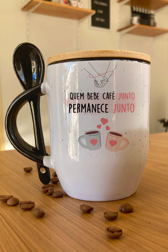 Este kit de presente é perfeito para surpreender o amor da sua vida. Ele inclui uma caneca de cerâmica de alta qualidade, com a frase "QUEM BEBE CAFÉ JUNTO PERMANECE JUNTO".