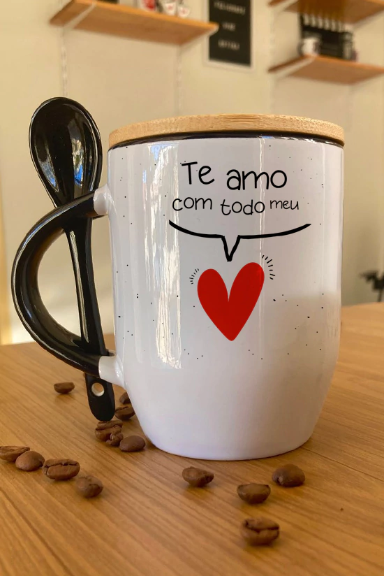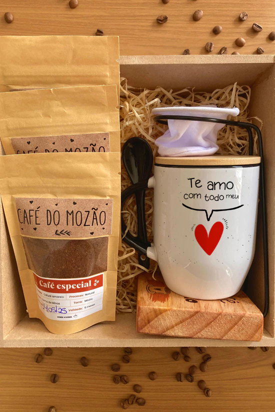 Este kit de presente é perfeito para surpreender o amor da sua vida. Ele inclui uma caneca de cerâmica de alta qualidade, com a frase "TE AMO COM TODO MEU CORAÇÃO".